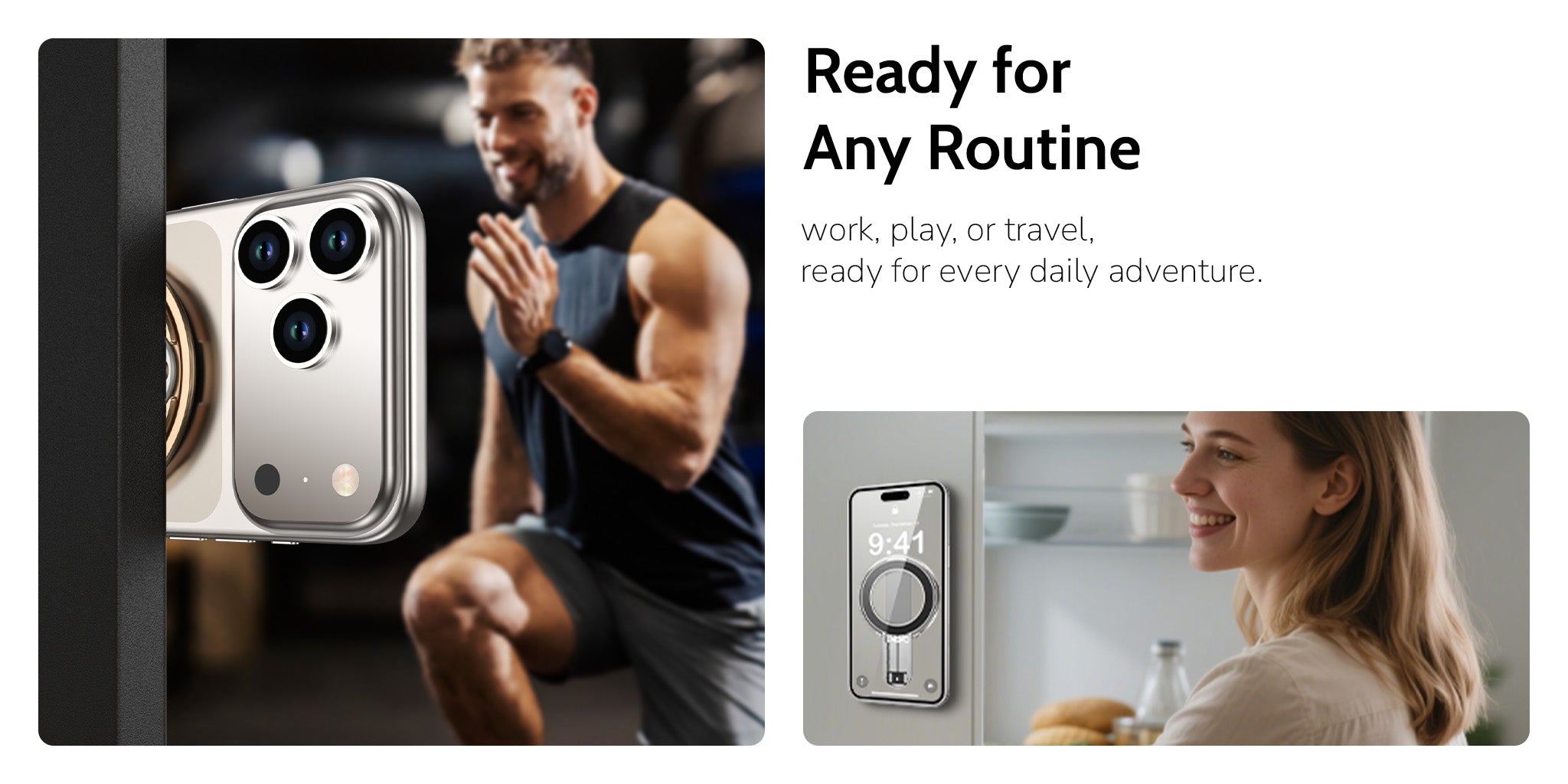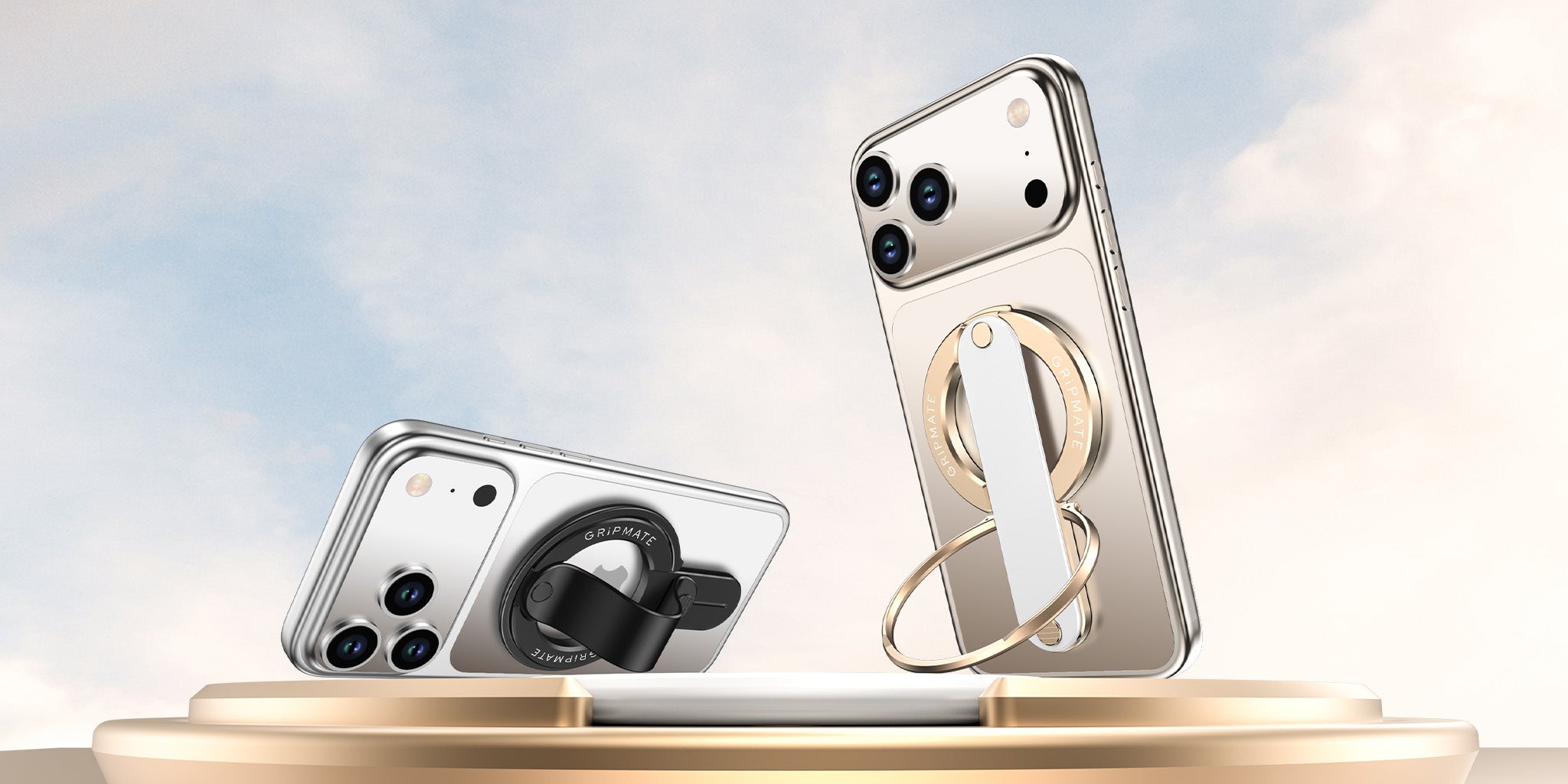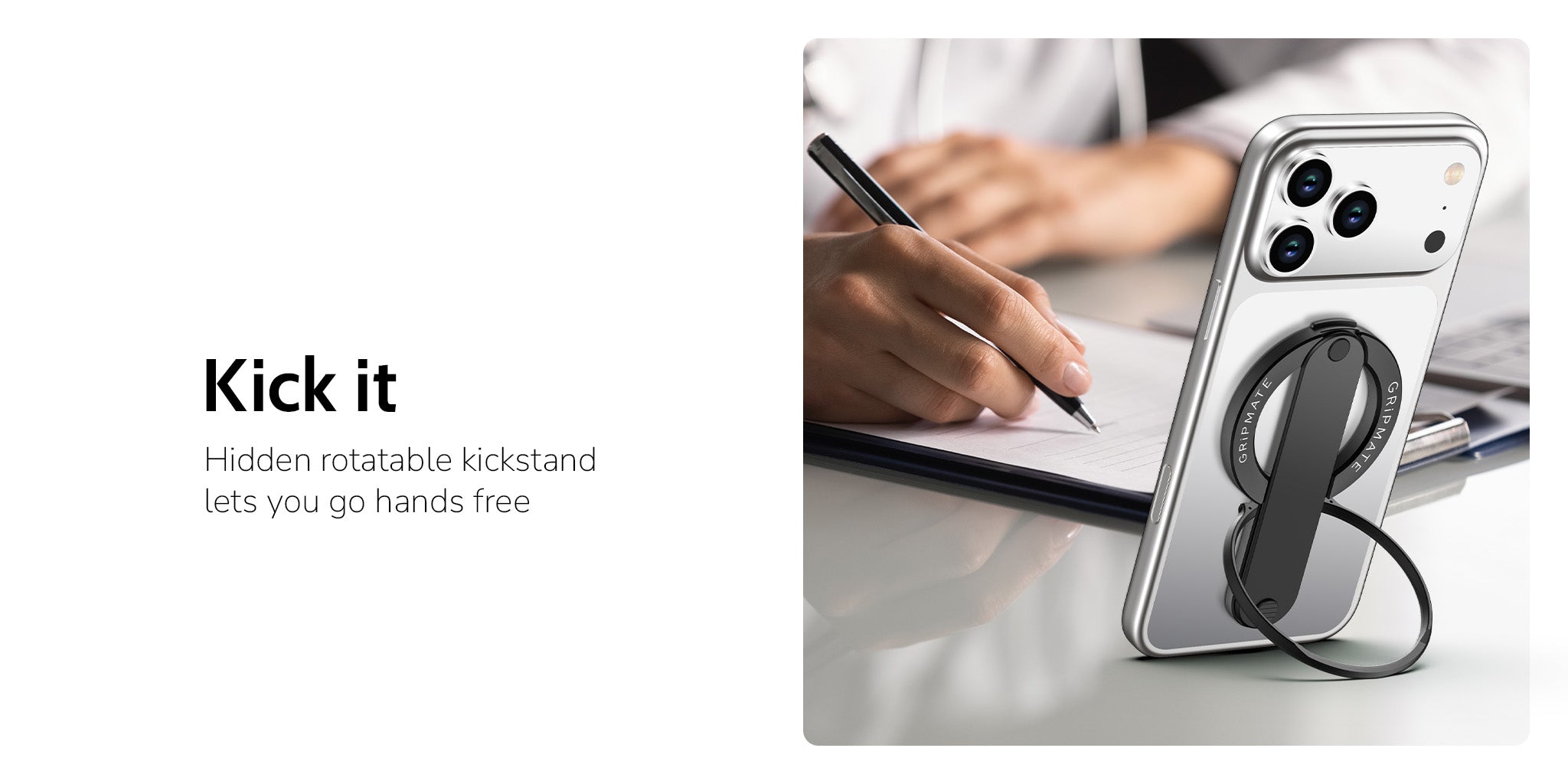 GripMate 2 has built-in magnets for automatically aligning and attaching to your MagSafe or PixelSnap compatible phone or a phone case with magnetic ring functionality.